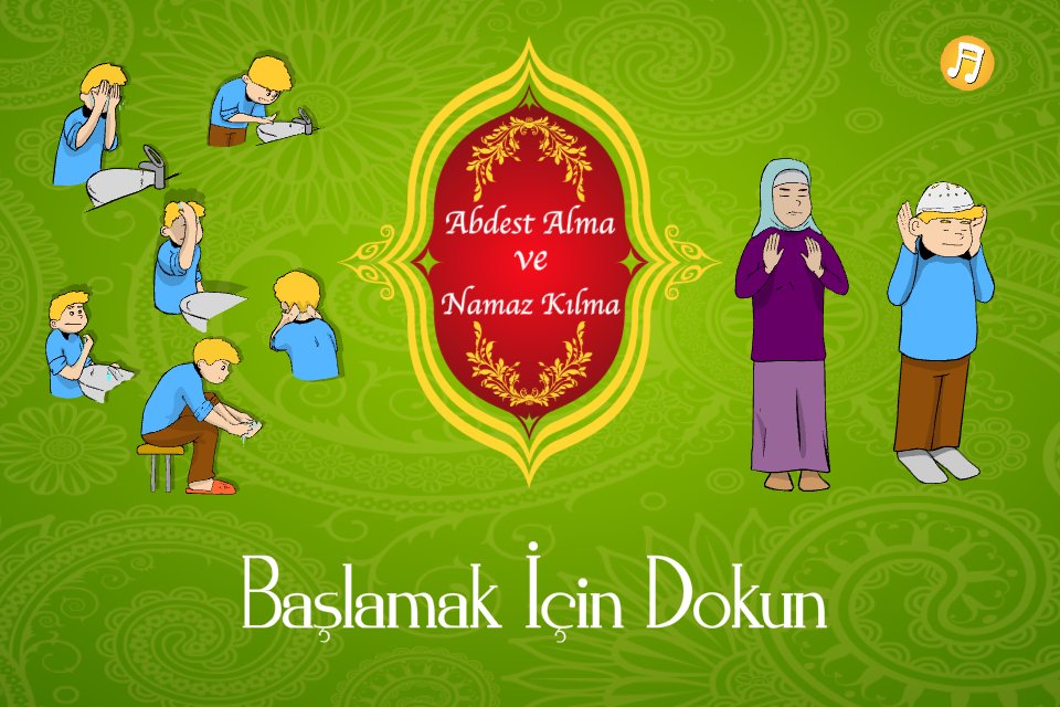 Namazın kılınışı örnek olarak sabah namazının iki rek'at farzının kılınışı resimlerle anlatilmış, erkek ve kadinlarin farklı hareketleri.