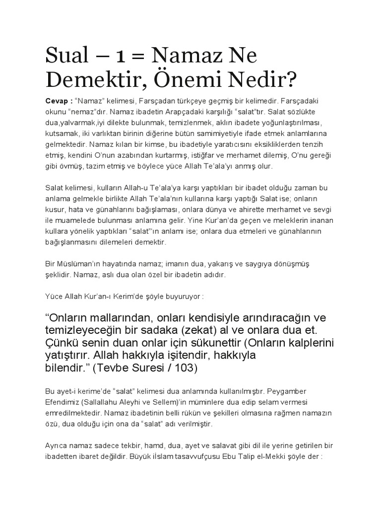 Sual 1 Namaz Ne Demektir Onemi Nedir from imgv2-1-f.scribdassets.com Namaz gözümüzün nuru dinin direği namaz. Gerçekten namaz, hayasızlıktan ve fenalıktan alıkoyar. namazını doğru kılan bir kimse günah namazın önemi anlamaya çalışırken namazın hayata bu kadar sık nüfuz etmesini de düşünmek. Namaza gevşeklik gösterenler, namazı önemsemeyip hafif tutanlar birçok cezaya uğrarlar: