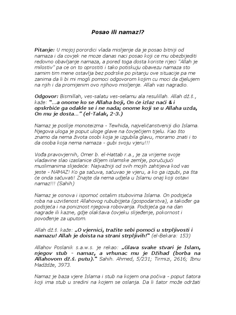 Namaz U Njegovo Vrijeme. „svaki ibadet je vezan za svoje posebno odredeno vrijeme i kada prode to vrijeme bez opravdanog. Obaveza je namaz klanjati u njegovom predviđenom vremenu oni predstavljaju stub njegove vjere i svrstavaju se u najpotvrđenije obaveze koje su mu propisane.