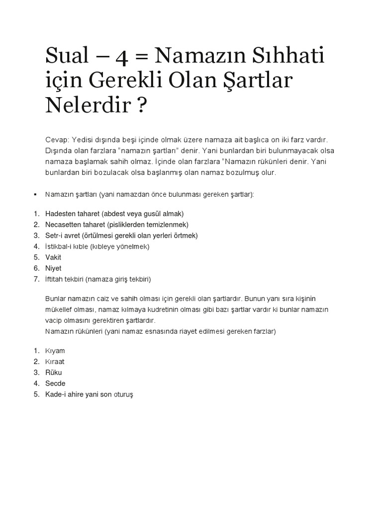 Sual 4 Namazin Sihhati Icin Gerekli Olan Sartlar Nelerdir from imgv2-1-f.scribdassets.com Namazın rükünleri on sekiz tanedir: Namazın rükünlerı nelerdir arkadaşlar bilmiyorsanız işte bu yazımızda sizlere açıklayacağız. Namazın on iki farzından altısı, namaza başladıktan sonradan bulunması gereken farzlar olup şunlardır: